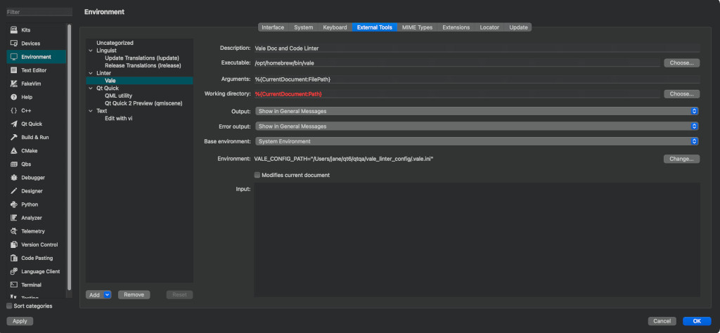 Vale Settings as an External Tool